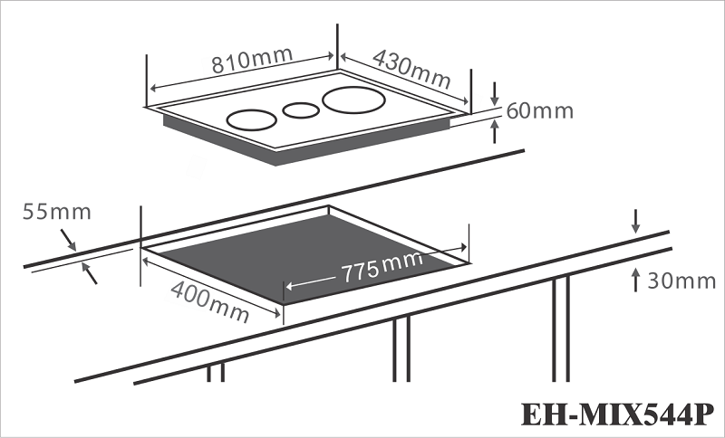 Bếp điện từ CHEFS EH-MIX544P có kích thước sản phẩm là W810 x D430 x H60(mm) và kích thước lắp đặt tương ứng W775 x D400(mm). 3 vùng nấu của bếp có kích thước lần lượt là: