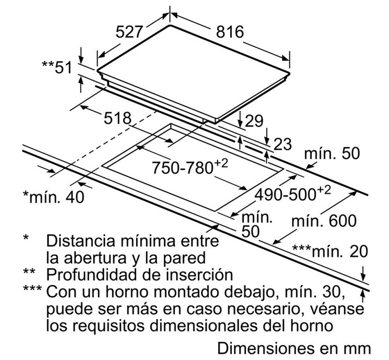 Bếp từ BOSCH PIE875DC1E bao gồm 4 vùng nấu với tổng kích thước sản phẩm: 51x816x527 (mm) và kích thước lắp đặt: 51x750-780x490-500 (mm).