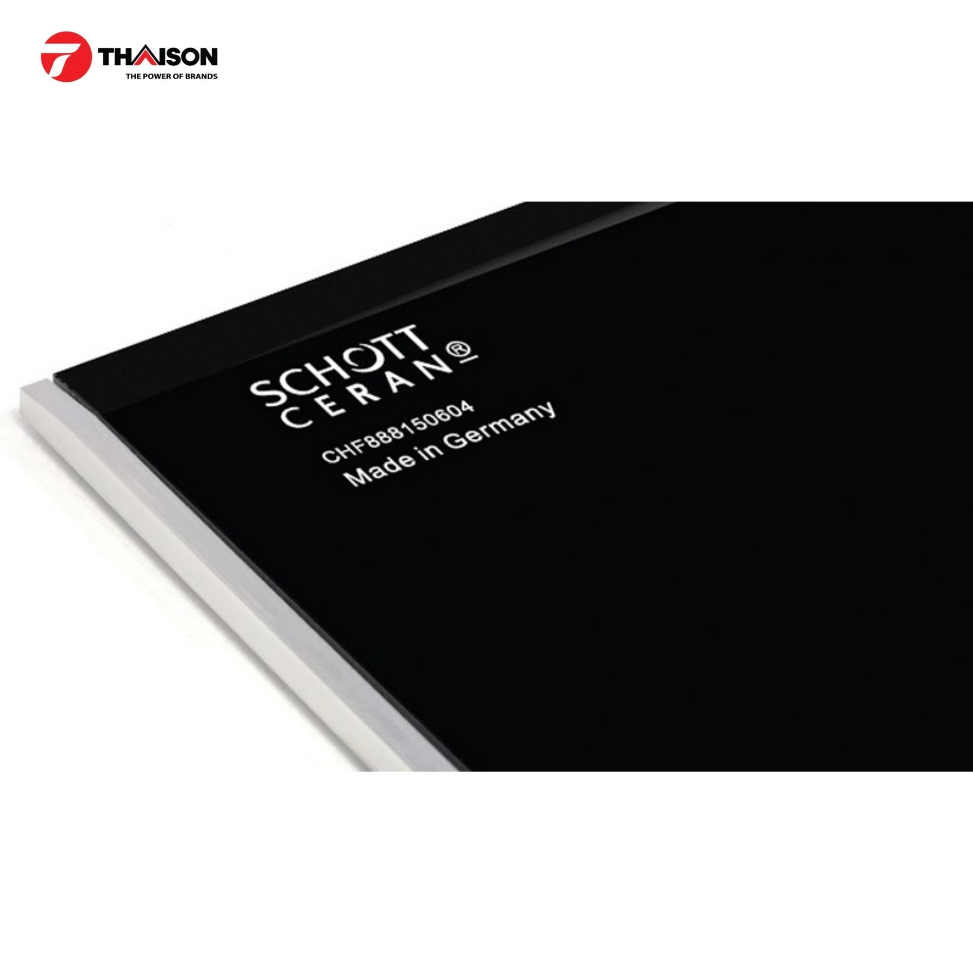 Bếp có phần mặt kính được chế tác từ Schott Ceran của Đức với thiết kế vát cạnh trước sau và bo viền nhôm 2 bên giúp vừa tạo điểm nhấn vừa giúp bảo vệ an toàn bề mặt kính. Cấu tạo sợi gốm Ceran là một chất liệu cao cấp chuyên dùng cho bếp từ, có độ bền, khả năng chịu lực, chịu nhiệt tới 1000 độ C, chống xước và chống bám bẩn vô cùng tốt.
