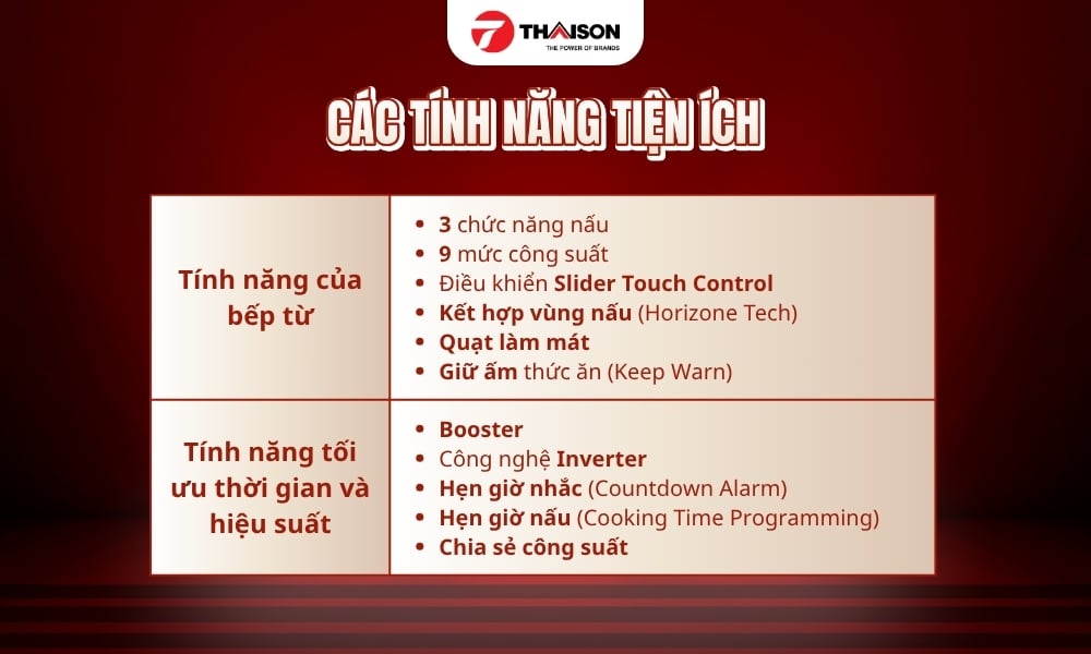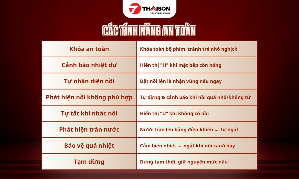 Khóa an toàn | Safety Lock | Khi kích hoạt chức năng này, bếp vẫn hoạt động bình thường, nhưng toàn bộ bảng điều khiển sẽ bị vô hiệu hóa, chỉ còn nút nguồn (on/off) là có thể sử dụng. Tính năng này rất hữu ích khi bạn cần làm việc trong bếp và muốn đảm bảo an toàn cho trẻ nhỏ xung quanh. |