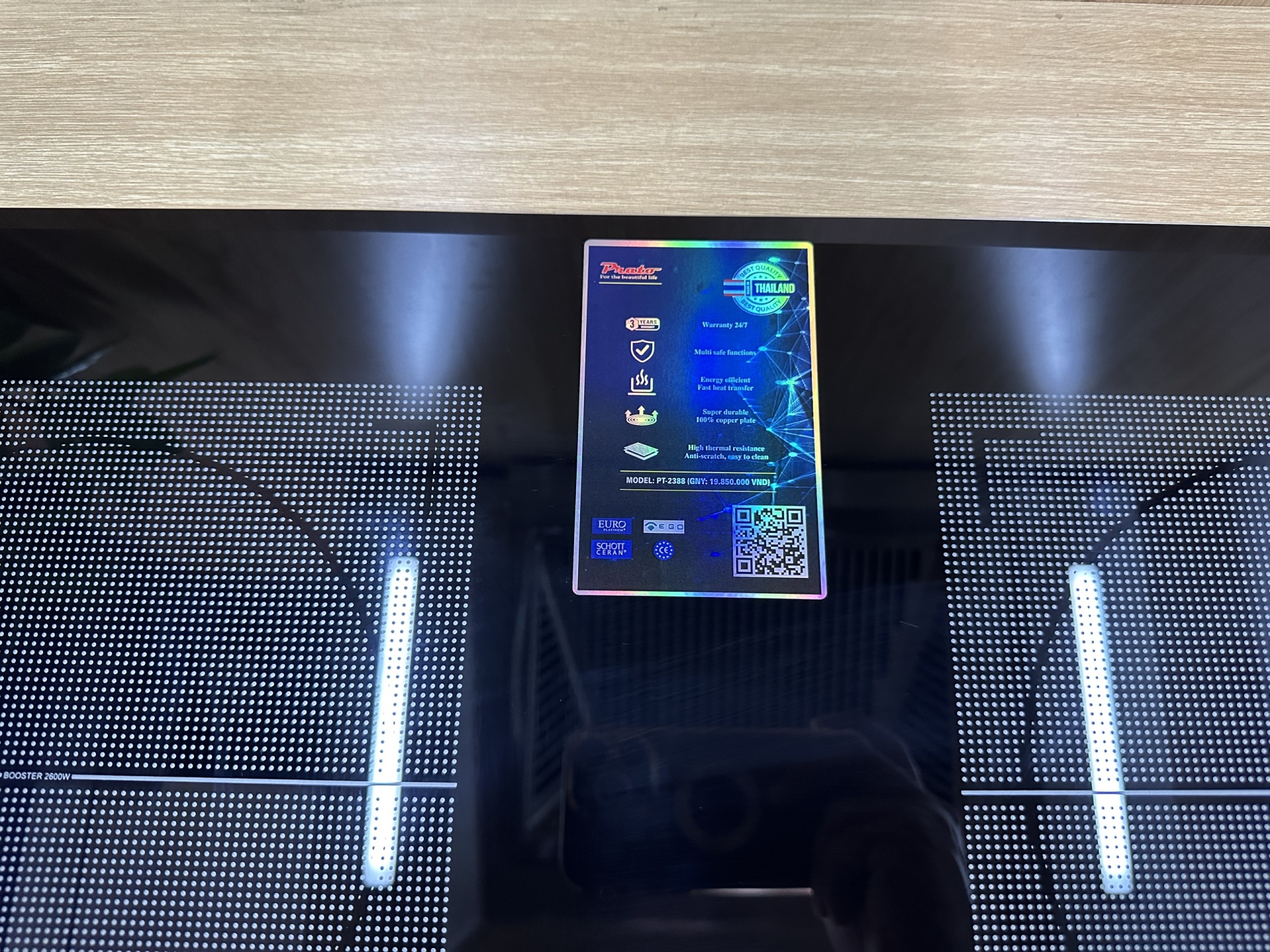 Bếp từ Prato PT-2388 2 vùng nấu sử dụng mặt kính chịu nhiệt khá tốt, giúp bếp hoạt động bền bỉ theo thời gian. Xung quang bếp được bo viền nhôm rất cẩn thận giúp hạn chế tình trạng va đập khiến nứt, vỡ mặt kính. Ở mỗi vùng nấu được phủ 1 lớp nano chống xước tạo điểm nhấn cũng như giúp mặt kính hạn chế tình trạng xước, vỡ. Bụng bếp được thiết kế từ hợp kim nhôm cao cấp trông rất sang trọng, ngoài ra nó còn giúp tránh tình trạng oxi hoá, rò gỉ điện.