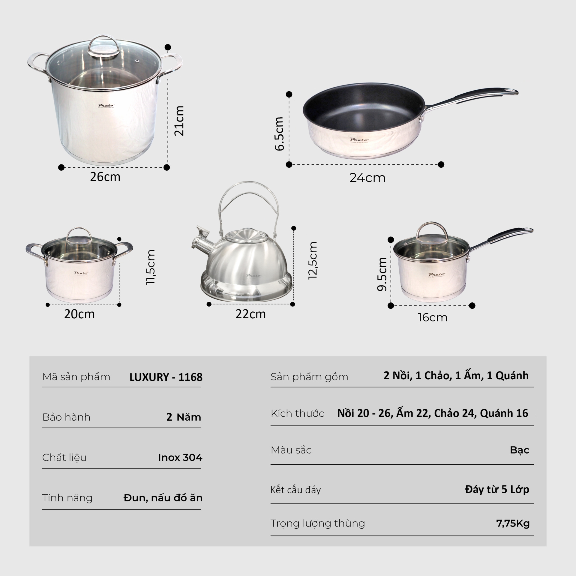 Kích Thước chi tiết của bộ nồi Prato Luxury 1168