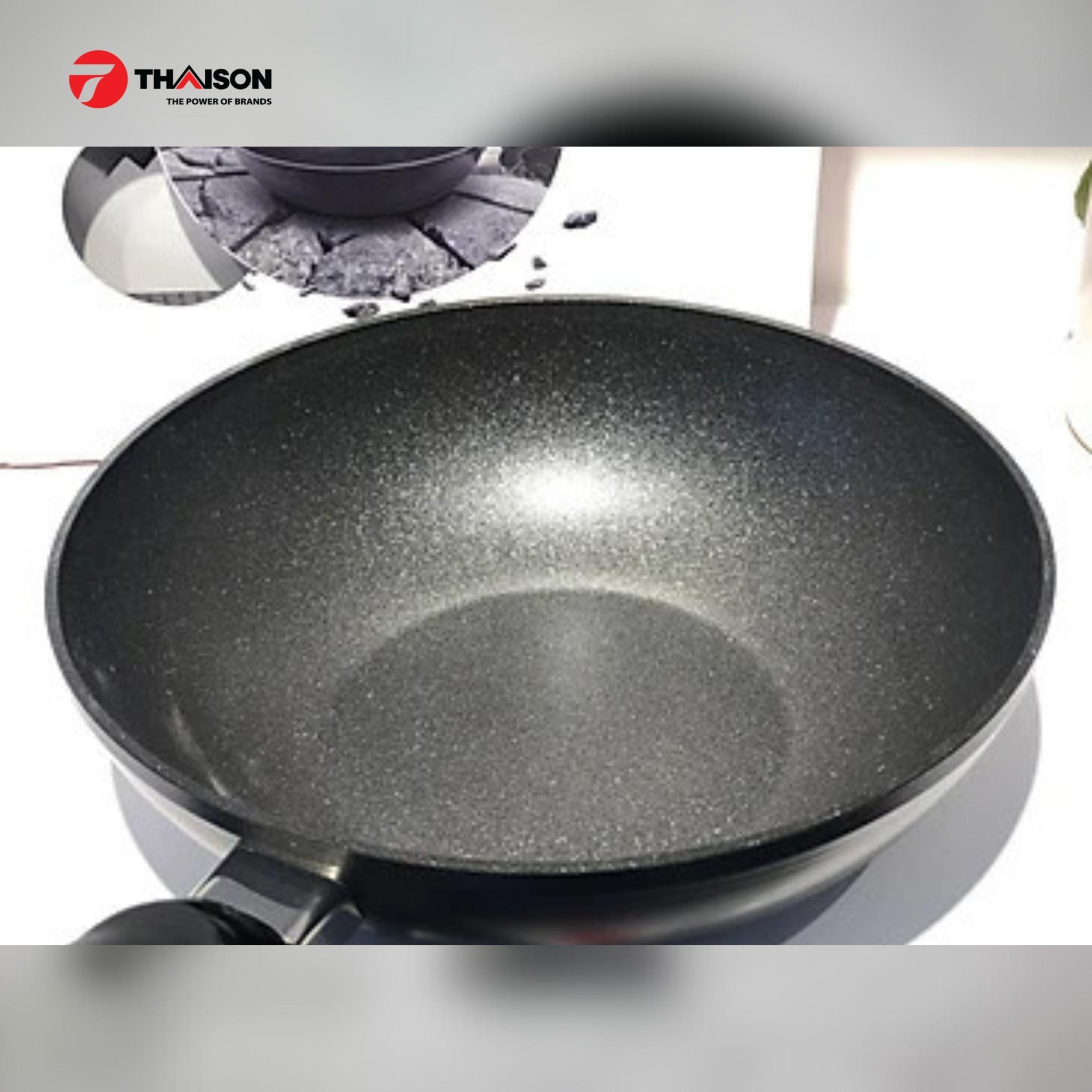 - Chảo có đáy sâu 3 lớp chống dính và lòng chảo rộng, giúp truyền nhiệt đều và tăng khả năng chịu nhiệt.