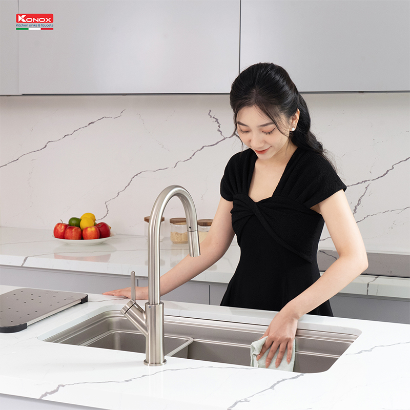 Chậu rửa nhỏ: Konox trang bị thêm một chậu rửa kích thước 380mm, được thiết kế riêng để vừa vặn với bồn bếp, mang đến sự tiện lợi khi cần rửa lượng nhỏ thực phẩm hoặc đồ dùng.