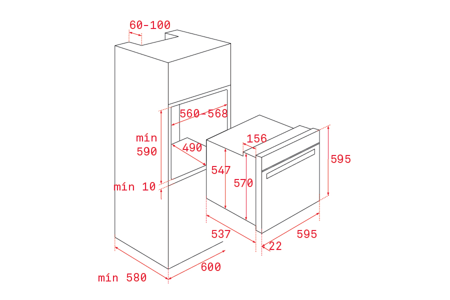 Sản phẩm được thiết kế lắp âm được giúp căn bếp trở nên gọn gàng hơn. Lò nướng có tổng kích thước (CXRxS): 595x 595 x 559 (mm).