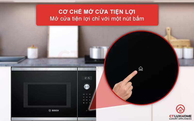 Lò vi sóng Bosch BEL554MS0B được trang bị tính năng mở cửa tự động bằng nút bấm cảm ứng. Chỉ cần chạm nhẹ, cửa lò sẽ mở ra nhanh chóng và êm ái, tạo sự tiện lợi tối đa trong quá trình sử dụng.