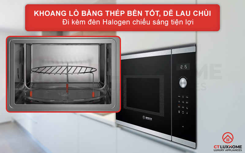 Khoang lò vi sóng Bosch BEL554MS0B có dung tích 25 lít, được thiết kế rộng rãi, phù hợp cho nhu cầu nấu ăn hằng ngày của gia đình từ 3 – 5 người. Cửa kính được thiết kế cách nhiệt 3 lớp giúp giữ nhiệt tốt và an toàn trong quá trình sử dụng. Bên trong, khoang lò được tráng men cao cấp, chống bám bẩn, giúp việc vệ sinh sau khi nấu trở nên đơn giản hơn nhiều.