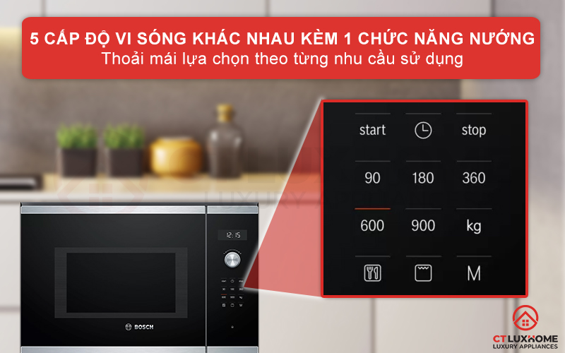 Lò vi sóng Bosch BEL554MS0B hỗ trợ 5 mức công suất vi sóng (tối đa 900W), cho phép tùy chỉnh linh hoạt theo từng loại thực phẩm. Bạn có thể dễ dàng hâm nóng, rã đông hay nấu chín đồ ăn mà vẫn giữ được hương vị và độ tươi ngon vốn có. Ngoài ra, máy còn tích hợp chức năng nướng kết hợp ở mức công suất 360W, giúp các món ăn như pizza, thịt nướng hay bánh mì có lớp vỏ giòn rụm mà bên trong vẫn mềm ẩm.