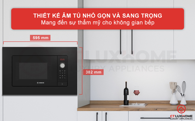 Lò vi sóng Bosch BEL653MB3 có thiết kế mặt kính đen bóng kết hợp viền thép không gỉ, tạo điểm nhấn tinh tế cho căn bếp. Thiết kế âm tủ gọn gàng giúp tiết kiệm diện tích và mang lại sự đồng bộ trong không gian. Khoang lò dung tích 25 lít, làm bằng thép không gỉ bền bỉ, có đèn LED chiếu sáng rõ ràng, cho phép bạn quan sát món ăn trong quá trình nấu.