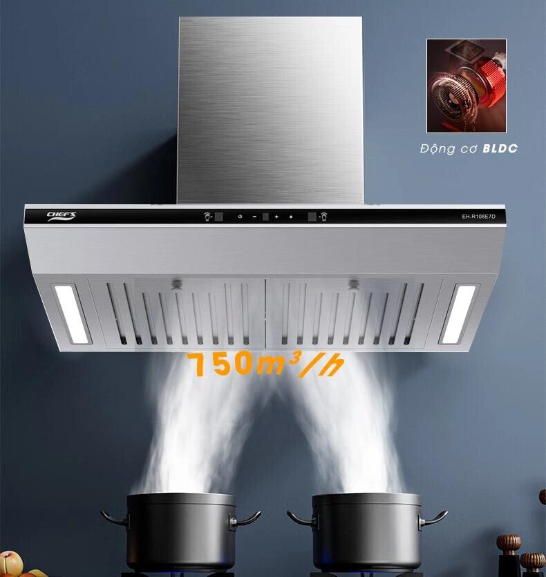 Máy hút mùi Chefs EH-R108E7D có công suất cực mạnh mẽ có tới 3 mức công suất hút giúp linh hoạt và tăng hiệu quả khử mùi. Máy có công suất tối đa lên tới 750 m3/h nhưng máy hoạt động rất nhẹ nhàng với động cơ BLDC làm giảm độ ồn chỉ dưới 45 dB tránh gây khó chịu khi nấu ăn.