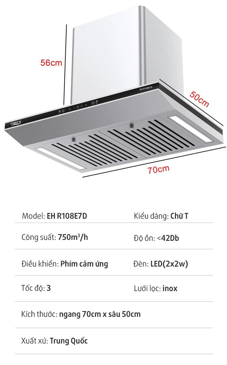 Máy hút mùi Chefs EH-R108E7D có thiết kế dạng chữ T sang trọng có màu xám bạc inox được cấu tạo chính từ chất liệu không gỉ, chống bẩn nên dễ dàng vệ sinh. Máy sử dụng điều khiển không chạm kết hợp điều khiển cảm ứng giúp điều khiển linh hoạt. Máy có tổng kích thước máy chỉ 700 x 500 x 560 mm, đường ống kích thước 150 mm.