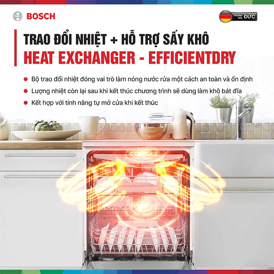 Máy rửa bát Bosch SMV6ECX51E sử dụng công nghệ sấy trao đổi nhiệt Heat Exchanger kết hợp sấy hé cửa cuối mỗi chu trình giúp bát đĩa khô sạch, không bị đọng nước.